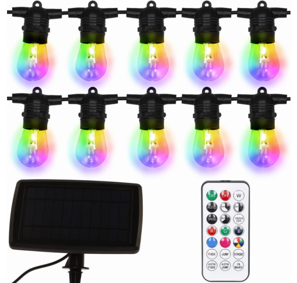LED diody RGB – svítí v mnoha barvách Dálkové ovládání – měňte barvy, režimy a jasnost bez nutnosti pohybu Solární napájení + akumulátor 3600 mAh – žádná elektřina, maximální pohodlí 10 LED žárovek – energeticky úsporné a dlouhověké Rozestup každých 100 cm + dlouhý napájecí kabel – ideální pro větší prostory Odolnost proti postříkání (IP44) – bezpečné použití venku Skvělá dekorace pro každou příležitost – svatby, grilování, svátky, večery s přáteli Moderní a pevný design – nejen svítí, ale vypadá elegantně