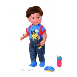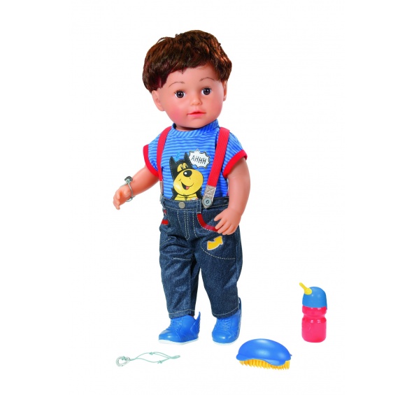 BABY born® a její sestřičky neustále vymýšlejí, jak by mohly nachytat svého bratříčka. Stačí ale jeden pohled na BABY born® bratříčka a z jeho nezbedného pohledu je hned jasné, že i on je všemi mastmi mazaný a v rukávu má ještě větší nezbednosti, které chystá na své sestřičky. Hnědé vlásky má skoro vždy rozcuchané, protože si prostě pořád hraje a není čas ztrácet čas česáním. Když to ale někdy přeci jen musí být, je po ruce kartáč a vlásky jsou hned upravené. Bratříček má na sobě bezva pruhované tričko, džíny s kšandami a fešácké okřídlené boty. Jeho oblíbenou zábavou je hra na schovávanou. Ukryje se za záclonami a jakmile jde hledající kolem, skrčí se pod stůl. Má totiž ohebná kolena. Au, ale teď se uhodil hlavou o nohu stolu. To ho rozplakalo. Aby se uklidnil a dobil baterie, lokne si vody ze své lahvičky. Kdepak se malý uličník skrývá teď? Že by už čekal v koupelně, až se bude moct vykoupat ve vaně? • Panenka Starší bratříček BABY born® • Má šest životních funkcí • Rozmanitá “hra na” s panenkou BABY born® povzbuzuje představivost a bylo prokázáno, že podporuje vývoj sociálních dovedností a hodnot jako je odpovědnost, komunikace a empatie • Funguje bez baterií Součástí balení je mnoho doplňků: tričko, kalhoty s kšandami, boty, lahvička, kartáč na vlasy a náramek pro BABY born® bratříčka i jeho malou maminku.
