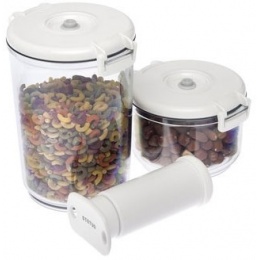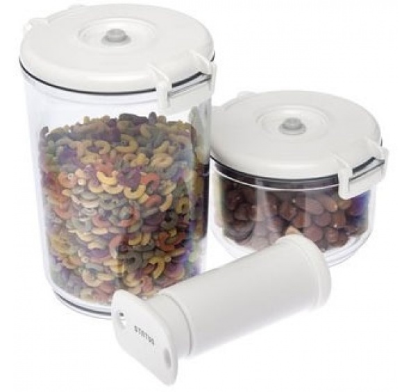 5-dílný set se doporučuje jako alternativní "startovací set" pro vakuové skladování potravin, protože obsahuje nejpoužívanější boxy s odkapávací mřížkou a ruční pumpu na vysátí vzduchu. Uložením všech druhů potravin do vakuových kontejnerů prodloužíte jejich čerstvost. Různé oválné boxy jsou kromě jiného vhodné na uskladnění všech druhů potravin: ovoce, zelenina, koření, maso, těstoviny, ... Vařené, sušené nebo otevřené jídlo. Možností je mnoho. Vakuové skladování potravin má mnoho výhod: prodloužené zachování čerstvosti, aromatu potravin (pomalá oxidace a degradace potravin, snížení zápachu)Oválný tvar zaručí vhodné využití místa na kuchyňské polici, stole, v ledničce nebo mrazáku. Kromě toho jsou boxy stohovatelné.Vakuové nádoby se mohou umývat tradičními čistícími prostředky i v myčce na nádobí. Nepoužívejte škrabku, drsné kartáče a ani silné čistící prostředky. Při umývání dávejte pozor, abyste nepoškodili okraje nádoby, těsnění nebo ventily.5-dílný set se doporučuje jako alternativní "startovací set" pro vakuové skladování potravin, protože obsahuje nejpoužívanější boxy s odkapávací mřížkou a ruční pumpu na vysátí vzduchu.