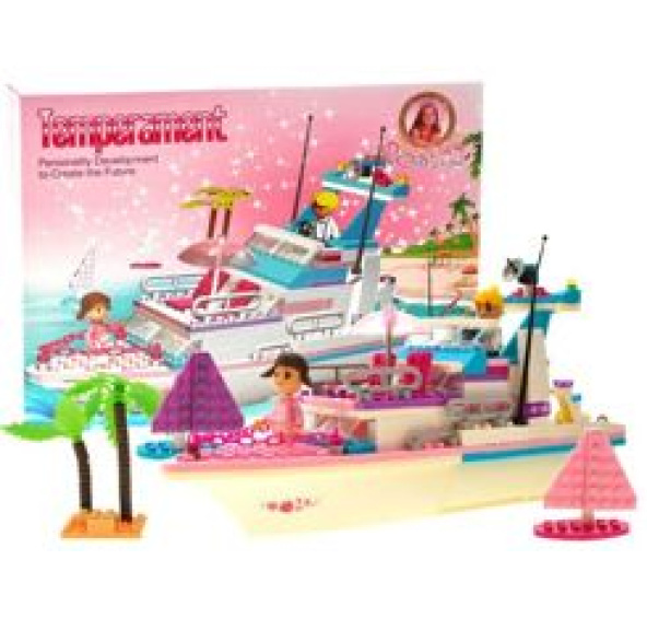 Senzační, kreativní a megadívčí bloky, ze kterých si můžete postavit nádhernou jachtu pro plavbu po mořích, oceánech a dvě plachetnice. Jachta má otevřenou palubu a slunečník. Mezi doplňky patří palma, lidské postavy.