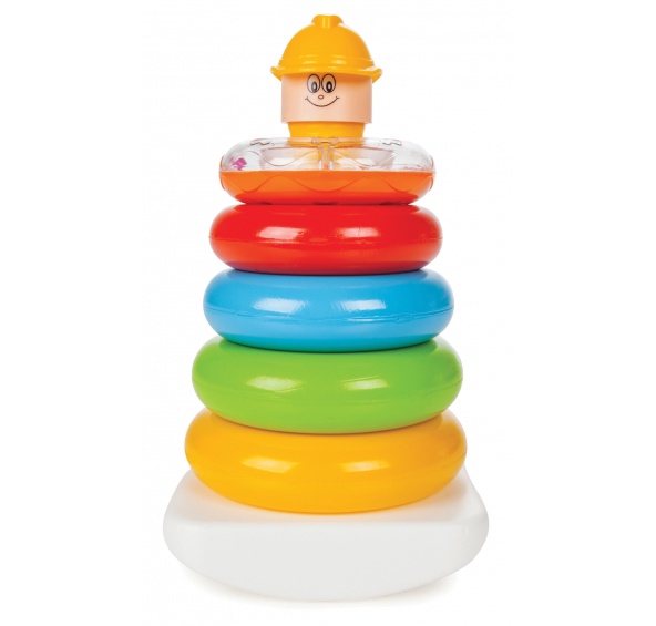 Skládací pyramida z 5 barevných kruhů na podstavci, ten vrchní je průhledný s kuličkami.. Výška výrobku 23 cm. Pomáhá dítěti v rozvoji motoriky.
