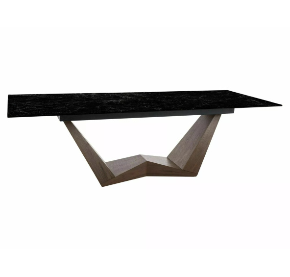 Stůl rozkládací, deska: tvrzené sklo + italská keramika, NERO GRECO, konstrukce: MDF + ořechová dýha, barva: černá / ořech.