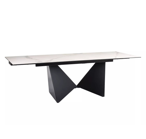 Rozkládací stůl, deska: tvrzené sklo + keramika STATUARIO VENATO, konstrukce: MDF, barva: bílý mat / černý mat.