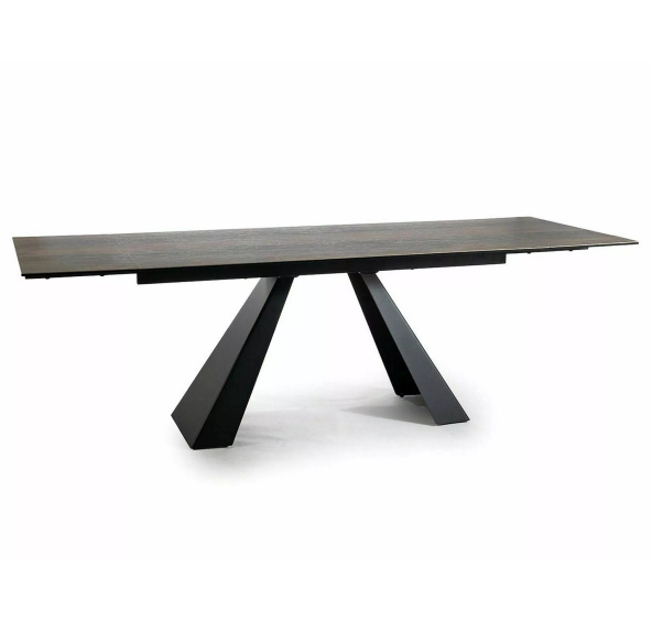 Rozkládací stůl, deska: tvrzené sklo + španělská keramika LEGNO, efekt dřeva, konstrukce: kov, barva: hnědá / černý mat.