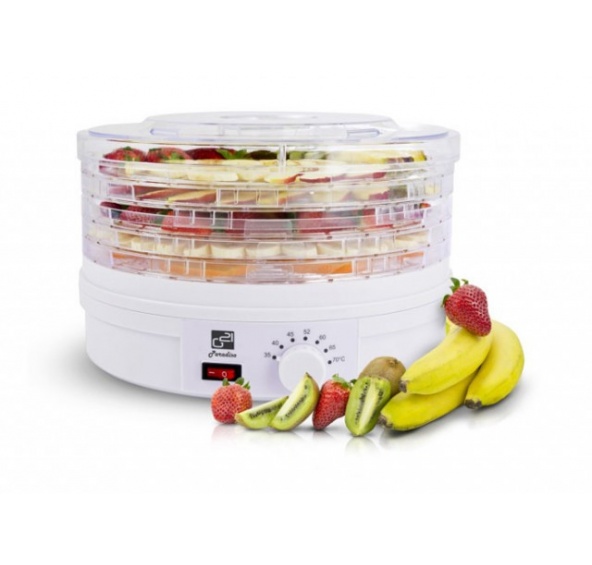 Sušička ovoce G21 Paradiso small je určena ke snížení obsahu vody v potravinách, jako je například ovoce, zelenina, bylinky, houby, a podobně. Je opatřena 5 výškově nastavitelnými platy o průměru 32 cm. Sušení potravin prodlužuje možnou dobu skladování a je zároveň jedním z nejzdravějších způsobů jejich uchování a konzervace. Je alternativou k jiným druhům konzervování, jako je například mražení, solení či zavařování. Sušička G21 Paradiso small Vám garantuje, že se všechny kousky potravin budou sušit rovnoměrně. Potraviny v ní absorbují teplo a následně uvolňují vlhkost v podobě vodní páry. V sušičce je 5 výškově nastavitelných plat o průměru 32 cm, na které můžete ovoce a zeleninu pohodlně vyskládat. Je opatřena regulátorem nastavení teploty a pojistkou proti přehřátí. K sušení používejte suroviny v co nejlepší kvalitě, tedy zralé a čerstvé. Pokud ovoce není zralé, nedosáhne při sušení správné barvy, pokud je přezrále, bude zase příliš měkké a kašovité. Doporučujeme také plody začít sušit co nejkratší dobu po jejich sběru.