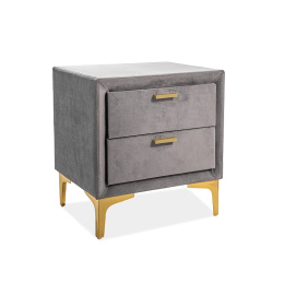 Čalouněný noční stolek originálního vzhledu. Konstrukce je z kvalitního přírodního dřeva potažena látkou. Úchyty a nožky stolku jsou ve zlaté barvě.