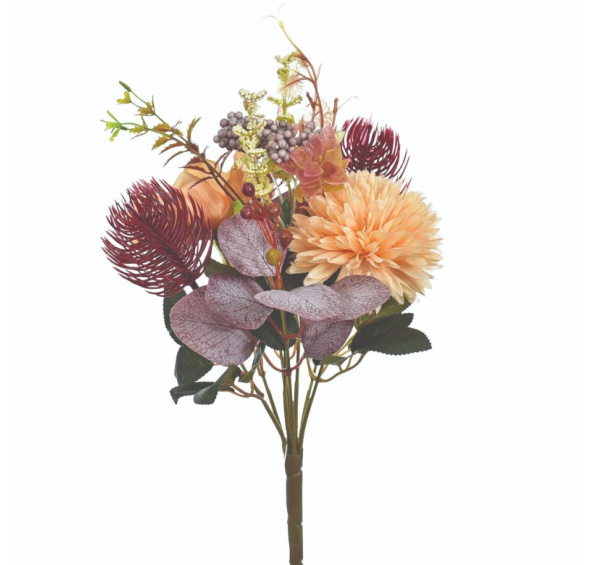 Vyrobený z vysoce kvalitních materiálů, kytice vypadá jako živá a okouzluje přirozeností detailů. Bordové květy a broskvové akcenty vytvářejí útulnou atmosféru, ideální pro dekoraci v podzimním období nebo po celý rok.