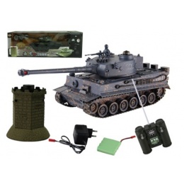 1:24 RC TIGER TANK VS BUNKER Popis: bitevní tank na R/C dálkové ovládání s radiovým signálem, vybavený dělem s infračerveným světlem.Obsah sady: Tank, dálkové ovládání, bunker a mina Funkce: reálné pohyby – jízda vpřed/zpětný chod, otočná věž o 320° , stoupání 45°, otáčení o 360°, pohyblivé dělo, 3 životy, indikátor světla života s LED, simulace zvuků a světla Základní parametry: Frekvence A / B = 27 MHz. Dosah dálkového ovládání: ± 12 metrů. Dosah infračerveného světla: ± 8 metrů.Maximální rychlost: ± 4 Km/hod. Typy baterií: A skupina = Tank: akumulátorová, dobíjecí baterie 4.8V. Dálkové ovládání: nedobíjecí baterie 2× „AA“ 1.5V. Terč: nedobíjecí baterie 2× „AA“ 1.5V. Mina: baterie 3× „AG13“ 1.5V. B skupina = nedobíjecí baterie, tank: baterie 4× „AA“ 1.5V. Dálkové ovládání: baterie 2× „AA“, 1.5V. Terč: baterie 2× „AA“ 1.5V. Mina: baterie 3× „AG13“ 1.5V.