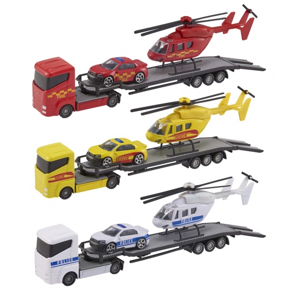 Popis produktu Teamsterz tahač + helikoptéra + autoSada tahače, osobního auta a helikoptéry- asort policie/hasiči/záchranka.