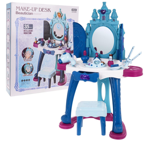 Toaletní stolek má rozměry přibližně 81 x 58 x 28 cm a má velkou desku se zásuvkou a policemi pro uložení veškerého příslušenství. Součástí balení je pohodlná stolička o rozměrech přibližně 18 x 19 x 15,5 cm. Hračka je napájena 3 bateriemi AA, které aktivují světelné a zvukové efekty.