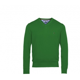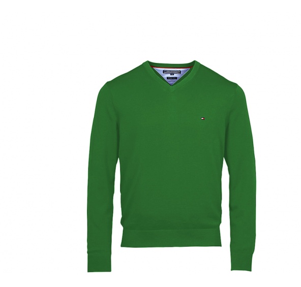 Tento svetr má klasický střih s žebrovaným V-výstřihem, dlouhé rukávy také s žebrovanými manžetami a nenápadnou výšivku loga Tommy Hilfiger vpředu na hrudi.