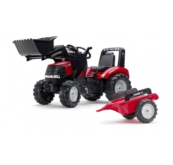 Traktor šlapací Case IH Puma 240CVX s valníkem a přední lžící tmavě červený s volantem s klaksonem. Z vysoce odolného a kvalitního plastu. Velikost 203×58×66 cm Věk 3+. Všechny traktory Falk jsou testovány na 50kg – dle požadavků evropských norem. Vyrobeno ve Francii.