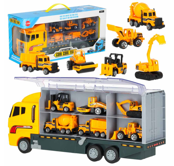 Velký nákladní automobil který umožňuje bezpečnou přepravu připojených malých vozů. Postavme si nový dům! K tomu potřebujeme těžkou stavební techniku, bagr, sklápěč nebo míchačka na beton - bez nich se žádná stavba neobejde. Abychom je bezpečně dopravili na místo určení, použijeme obrovský kamion! Malá kovová autíčka dokonale kopírují skutečné stroje.