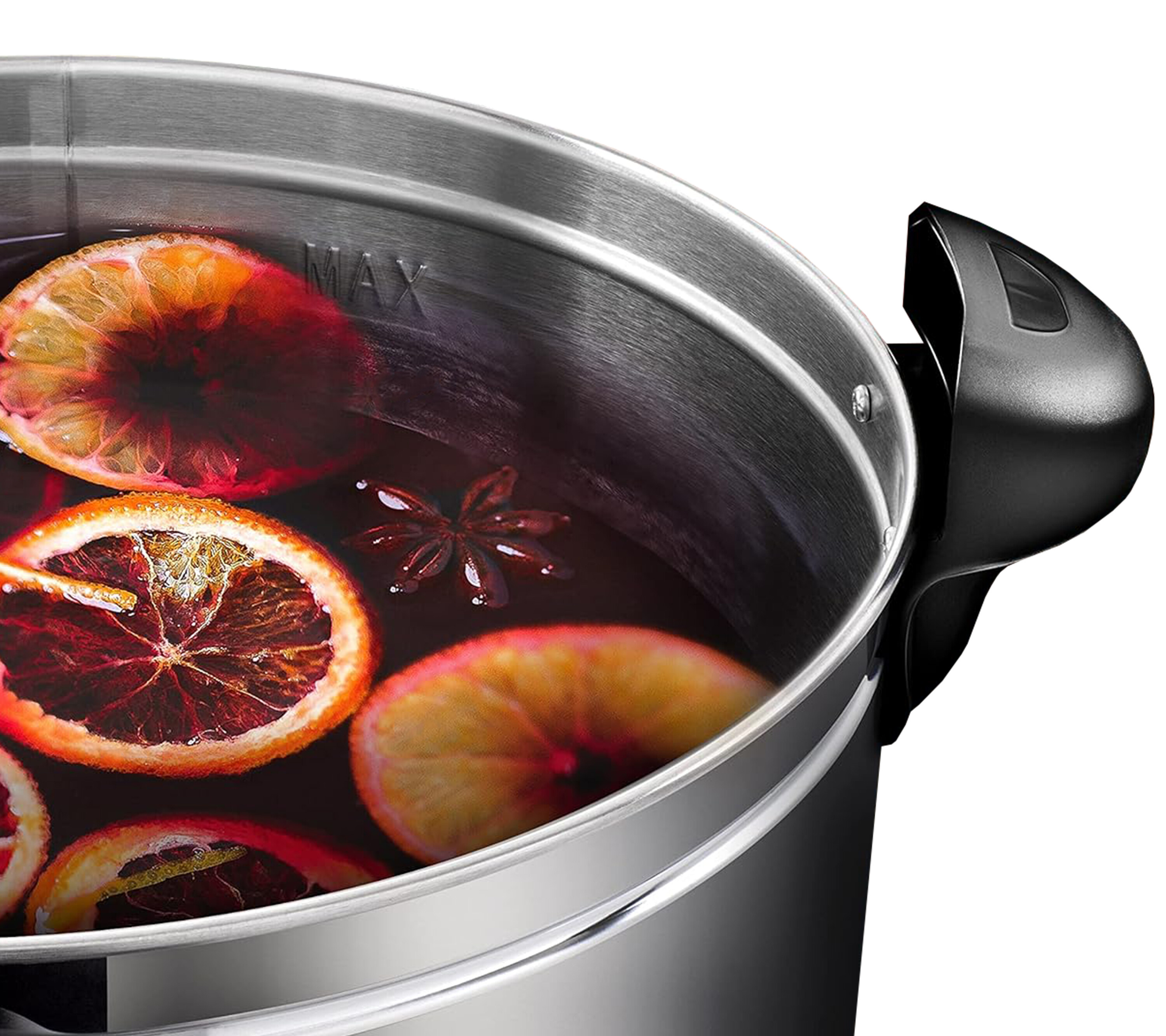 Nádoba má dvě značky pro minimální a maximální množství tekutiny v hrnci. Tyto údaje jsou mimořádně užitečné právě pro přesné pasterizování při vysoké teplotě. Pro Vaši bezpečnost se přístroj automaticky vypne, jakmile se už v nádobě nenachází žádná tekutina.