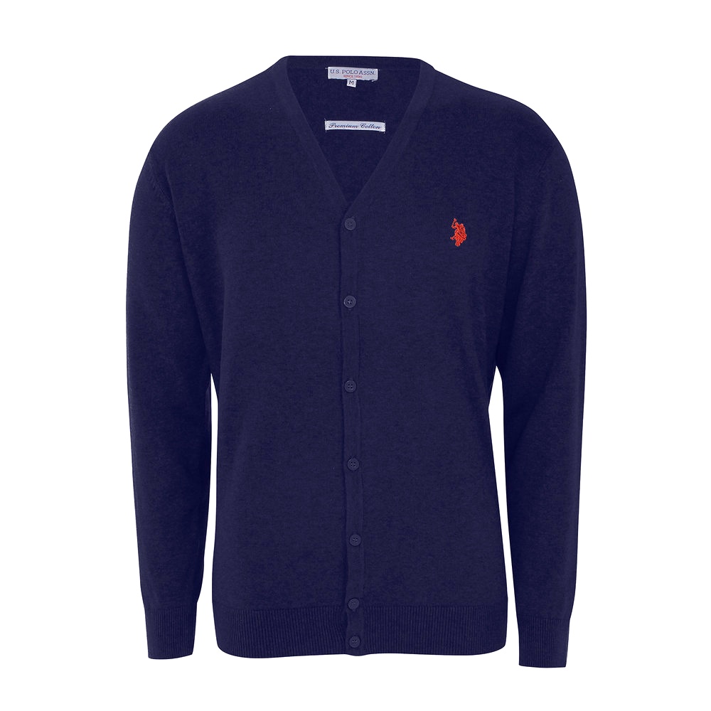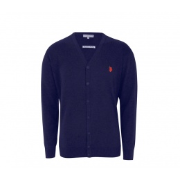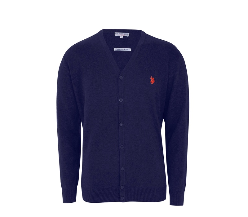 Pánský značkový svetr od firmy U.S. Polo Assn. vyrobený ze 100% bavlny s výstřihem do V a se zapínáním na knoflíky a vyšívaným logem na levé straně hrudi.