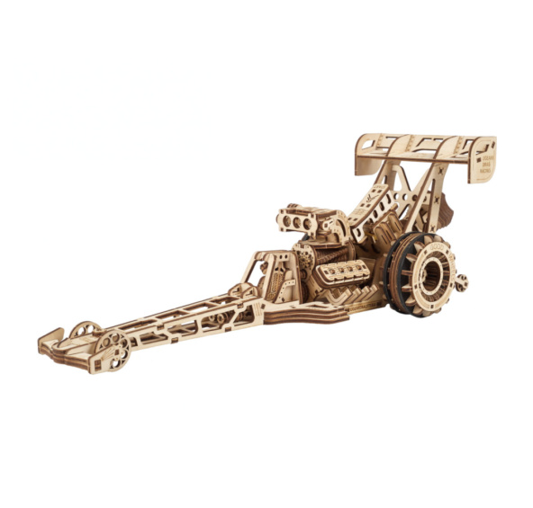 Za řevu motorů a vůně benzínu! Stavebnice závodního auta vyrobená z překližky. Zrychlete na hranice možností a nechejte se unést účelností konstrukce těch nejvýkonnějších vozů. Tvarem připomínajícím vážku se dragster stane jedinečnou ozdobou poliček v pokojích i kancelářích. Model je však stvořený k závodům ve sprintu, a je proto vybavený silným pružinovým motorem s dlouhou životností. Točivý moment je řemenem přenášen na pár velkých zadních kol, která jsou opatřena silikonovými kotouči upravujícími těžiště a zajišťujícími co nejlepší kontakt se závodní dráhou. Jízdu lze ovládat jednoduchou spouští a k běžným přesunům je vůz vybaven sklopnými kolečky. Ke sprintu jej připravíte plným natažením a sklopením opěry, pak se teprve stanete svědky „wow“ efektu typického pro závody ve sprintu – dragster se při startu postaví na svá zadní kola a plnou rychlostí vystřelí k cíli. Model podrobnostmi potěší každého nadšence mechaniky. Můžete pozorovat, jak se stisknutím spouště otevřou klapky sání motoru a díky otevřené konstrukci sledovat detaily pohonu při práci. Uvolněte všechnu tu nezkrotnou sílu a uspořádejte závody s dalšími modely UGEARS! Vybaveno detailním návodem k sestavení. Hlavní vlastnosti:321 precizně vyřezaných dílkůvysoká obtížnost sestavenívýsledný model je schopný samostatné jízdynavrženo a vyrobeno na Ukrajině