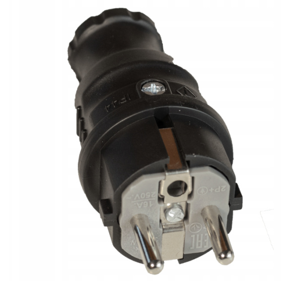Černá uzemněná pryžová zástrčka s krytím IP44 je součástí elektrické instalace, která zajišťuje bezpečné a spolehlivé spojení mezi elektrickými spotřebiči a elektrickou sítí.