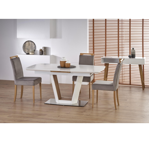 Popis produktu VALETTI stół rozkładany biały / dąb złoty (3p=1szt)wymiary: 160÷200/90/76 cm, stół rozkładany, materiał: MDF lakierowany / MDF laminowany / stal nierdzewna, kolor: biały mat - dąb złoty