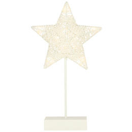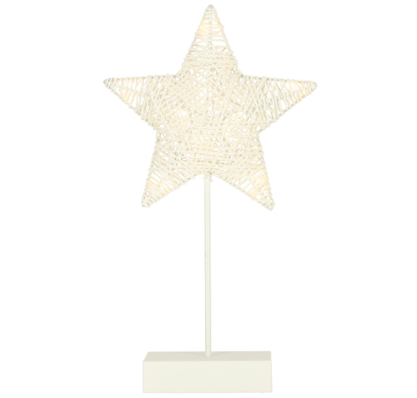 Stojící vánoční dekorace ve tvaru hvězdy. Zajistí měkké osvětlení a dodá interiéru slavnostní nádech. Je vybaven LED diodami v teplé žluté barvě. Je napájen 3 bateriemi AAA (nejsou součástí balení). Rozměry: 39 cm x 41,5 cm.