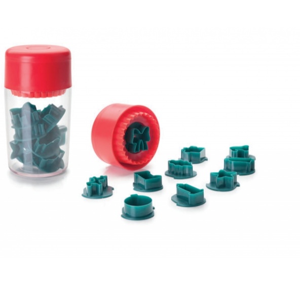 Sada je v praktické dóze, jejíž víčko slouží jako vykrajovátko koleček s vroubkovaným okrajem, do jehož středu můžete přidělat menší plastová vykrajovátka na vykrojení středu cukroví (vykrajovátka středů jsou ve tvaru vánoční ozdoby, Santovy čepice a boty,.