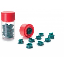 Sada je v praktické dóze, jejíž víčko slouží jako vykrajovátko koleček s vroubkovaným okrajem, do jehož středu můžete přidělat menší plastová vykrajovátka na vykrojení středu cukroví (vykrajovátka středů jsou ve tvaru vánoční ozdoby, Santovy čepice a boty,.