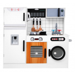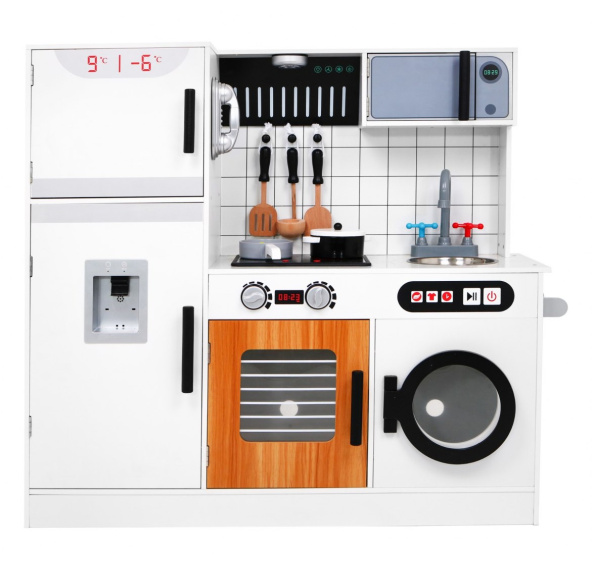 Popis produktu Velká dětská dřevěná kuchyňka 3+ bílá + interaktivní zvuky Světla + příslušenství
