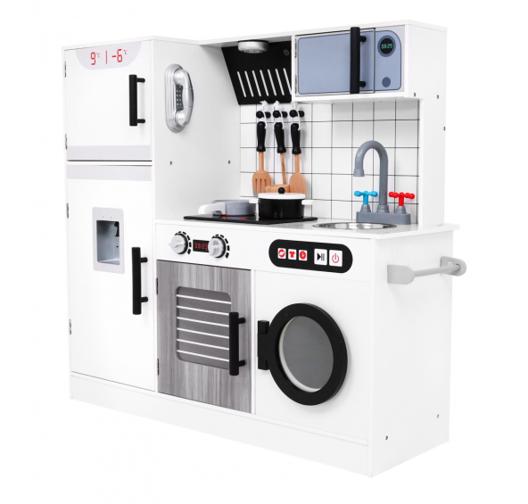 Popis produktu Velká dětská dřevěná kuchyňka 3+ šedá + interaktivní zvuky Světla + příslušenství
