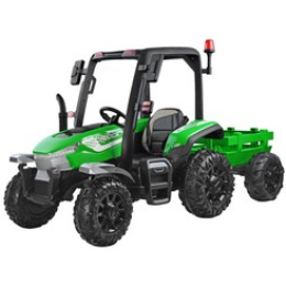 Díky 4 motorům si vozidlo snadno poradí s kopci, nerovnostmi nebo trávou. Rychlost vozidla se aktivuje přepínačem na palubní desce (pomalá, rychlá jízda) a pomocí dálkového ovladače 2,4 GHz, na kterém může rodič nastavit rychlost vozidla. Páčka, která se nachází na pravé straně, umožňuje dítěti přepínat jízdu vpřed, zastavení a zpátečku. Světla na traktoru může řidič zapnout stisknutím tlačítka. Traktor je vybaven brzdou, která se aktivuje po sejmutí nohy z plynového pedálu. Vybavení hudebním panelem, klaksonem, červeným blikajícím světlem kohouta.