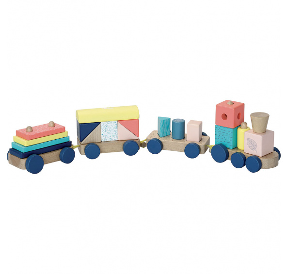 Dřevěná multifunkční hračka, vláček, na který můžete skládat kostky. Kostky mají různé velikosti, tvary a barvy. Mašinka a vagónky jsou spojeny textilními poutky s dřevěnou kuličkou. Vláček je pojízdný. Vhodné od 18 měsíců. Hlavní vlastnosti: multifunkční hračkaobsahuje 22 dílů