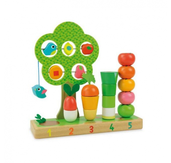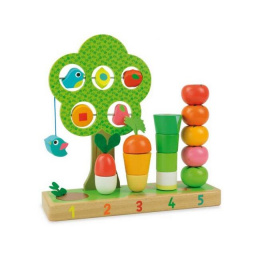 Hračka byla rozbalena. Produkt je kompletní a funkční. Hra, která probudí smysly dětí je ideální k učení počítání a rozeznávání tvarů. Tato dřevěná hračka se skládá ze základní desky, zeleniny a stromu s otočnýmí dílky. Zelenina obsahuje například mrkev, pórek a rajčata. Zeleninu a její dílky děti navlékají na dřevěné tyče. Hračky Vilac mají značku francouzské agentury ADEME, to znamená, že tyto dřevěné hračky jsou vyráběny ekologicky. Šetří životní prostředí, neznečišťují půdu, vodu a vzduch, neplýtvají energiemi. Hračka je certifikovaná pro věk 1,5+. Nejvyšší z tyčí je upevněna na provázku, v případě pádu dítěte na ní, se tyč odkloní. Hlavní vlastnosti: bezpečná a zábavná hračkarozvíjí logické myšlení a motoriku dítěte krásný desing, jemné barvy upoutají pozornost dítěte Již více než 100 let plní značka Vilac dětské sny. Společnost Vilac sídlí hluboko v srdci pohoří Jura, obklopena horami, jezery a lesy. Tato francouzská společnost vyrábí od roku 1911 dřevěné hračky v klasickém, starodávném stylu s moderními barvami a vzory. Hračky Vilac jsou jedinečné, nikdy nevyjdou z módy a dokáží okouzlit všechny generace. Vilac pomáhá utvářet dětskou představivost svými radostnými ilustracemi či dizajny a reinterpretací klasických hraček, které se jen tak neopotřebují. Děti dostávají na Vánoce a narozeniny spousty hraček, většina z nich je však nezaujme na dlouhou dobu, láska k hračce se nenaplní. Dřevěné hračky Vilac vzbuzují vášeň i o 50 let později, když jako dospělí náhodou najdete v podkroví hračky, které jste jako děti milovali. Vilac již 100 let propojuje děti s hračkami, které si oblíbí a váží si jich. A proč je děti tak milují? To zůstává tajemstvím firmy Vilac.