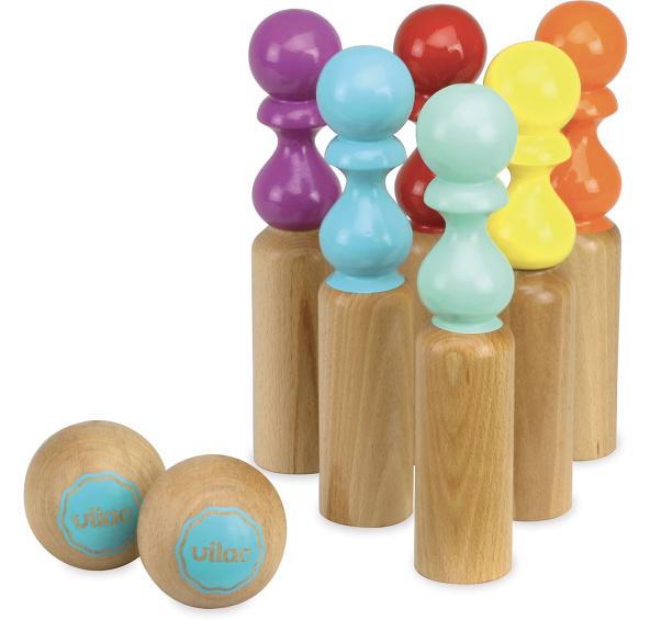 Kuželky z masivního dřeva jsou lakovány průsvitným a barevným lakem. Balení obsahuje 6 kuželek a 2 koule. Baleno v batůžku. Vyrobeno ve Francii. Hlavní vlastnosti: vyrobeno ve Francii