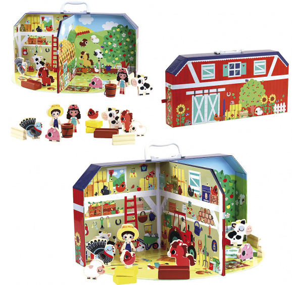 Rozměry: 41x25x26 cm Věk: 3+ Materiál: kartón Tento krásný box obsahuje 14 dřevěných doplňků a při otevření vyjeví 2 scény farmy: stodolu a zahrádku s výběhem v pozadí. Díky rukojeti je jednoduše přenosný. Hlavní vlastnosti: obsahuje 14 dřevěných doplňkůkompaktní rozměry boxu s praktickou rukojetí