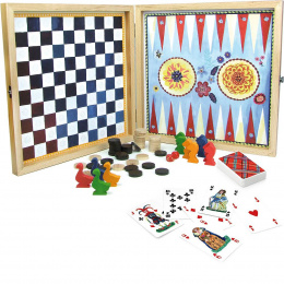 Klasické hry v nádherném dřevěném boxu. Ilustrováno Nathalie Lété. Obsahuje dámu, vrhcáby, karty a jiné hry. Vyrobeno ve Francii. Hračky Vilac mají značku francouzské agentury ADEME, to znamená, že tyto dřevěné hračky jsou vyráběny ekologicky. Šetří životní prostředí, neznečišťují půdu, vodu a vzduch, neplýtvají energiemi.