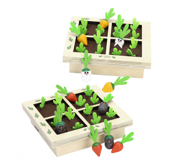 Budete první kdo odhalí všechny krtčí záškodníky? Originální hru můžete v jednodušší z variací hrát s menšími dětmi, nebo jako obdobu strategické hry Lodě v kolektivu starších dětí. Součásti hry kombinují silnou překližku, masivní dřevo či plsť a jsou poutavě, tématicky dekorované. Hlavní vlastnosti: pro 2 hráče2 hrací plochy, 2×12 červených mrkví a 2×4 krtci2 herní varianty, vhodné i pro menší dětijedinečné a atraktivní zpracování Zkrácený návod hry:Hráči libovolně do svého záhonku rozmístí krtky a mrkve. Hráči se na tahu střídají, vyberou si políčko v protihráčově záhonku a to ohlásí (např. C2), viz obrázek originální návod. Majitel záhonku poté dílek z daného políčka vyjme. Pokud odhalí mrkev, je na řadě majitel záhonku. Pokud odhalí krtka, je na tahu opět první hráč.Vítězem je hráč, který dokáže v záhonku protihráče najít 4 krtky. Dokumentace: Návod ke hře Zeleninová bitva (CZ)Návod ke hře Zeleninová bitva (SK)Návod ke hře Zeleninová bitva (FR, EN, DE, ES, IT, NL, PT, SE, DK)