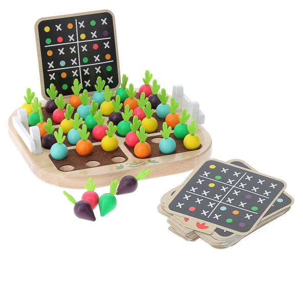 Zeleninové sudoku pro nejmenší! Cíl hry je jednoduchý – musíte umístit dřevěnou zeleninu do zahrádky dle jedné z kartiček, poté dle pravidel sudoku vyplnit prázdná políčka. V jednom čtverci, řádku a sloupci se nesmí opakovat stejná barva. Zábavná a barevná hra pro lidi všeho věku! Hlavní vlastnosti: atraktivní barevné provedeníhra pro všechny věkové kategoriepomáhá rozvíjet logické myšlení a soustředěnost dětírám zajišťuje stabilitu