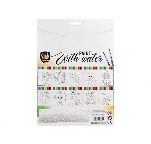 Vodní malování – malování pomocí vody. Obrázek vymaluješ pomocí štětce namočeného pouze ve vodě. Balení obsahuje 10 obrázků a dva štětce.