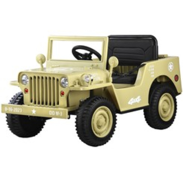 Klasické vojenské retro vozidlo má jednoduchou siluetu. Vozidlo je skvěle reprodukováno a imituje reálný automobil. Skvělý nápad na dárek pro mladého fanouška vojenské tematiky. Autíčko může řídit sám řidič, ale řízení může podporovat i rodič pomocí dálkového ovládání. Rozjezd vozidla je pomalý, aby se řidič nepolekal. Kola vozidla jsou vyrobena z plastu EVA a zajišťují pohodlnou jízdu. Vůz nemá dveře, ale je vybaven párem popruhů, které je nutné pro zajištění bezpečnosti připevnit přezkou. Během jízdy může dítě používat klakson, který je umístěn ve volantu. Světla ve voze lze zapínat a vypínat podle potřeby. Cestu malému řidiči zpříjemní hudební panel s předem nahranými melodiemi. Auto umožní min. hrát četníka ze Saint Tropez : ).