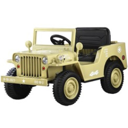Klasické vojenské retro vozidlo má jednoduchou siluetu. Vozidlo je skvěle reprodukováno a imituje reálný automobil. Skvělý nápad na dárek pro mladého fanouška vojenské tematiky. Autíčko může řídit sám řidič, ale řízení může podporovat i rodič pomocí dálkového ovládání. Rozjezd vozidla je pomalý, aby se řidič nepolekal. Kola vozidla jsou vyrobena z plastu EVA a zajišťují pohodlnou jízdu. Vůz nemá dveře, ale je vybaven párem popruhů, které je nutné pro zajištění bezpečnosti připevnit přezkou. Během jízdy může dítě používat klakson, který je umístěn ve volantu. Světla ve voze lze zapínat a vypínat podle potřeby. Cestu malému řidiči zpříjemní hudební panel s předem nahranými melodiemi. Auto umožní min. hrát četníka ze Saint Tropez : ).