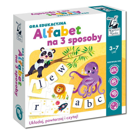 Vzdělávací hra "Abeceda na 3 způsoby" (3-7 let) je jednoduchá a účinná hra, která předškoláky seznamuje s výukou čtení v polštině a angličtině ve třech krocích: od poznávání písmen, přes jejich spojování s významem slov až po vytváření vlastních slov. Díky třem variantám her: hádanky, paměť, slovní hádanky se děti učí polskou a anglickou abecedu, upevňují si tvar písmen a učí se je skládat do slov. Rozvíjejí tak jazykovou představivost a koordinaci očí a rukou, která je nezbytná pro výuku čtení a psaní.