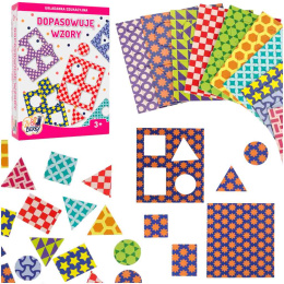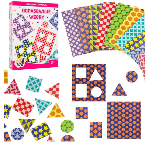 Sada podněcuje zvídavost a učí logickému myšlení. Puzzle se skládá z kartonových kartiček s kontrastními vzory, ve kterých jsou vystřiženy čtyři geometrické obrazce (kruh, čtverec, obdélník a trojúhelník). Úkolem batolete je přesně sladit tvar na správné místo tak, aby figurka i vzor vytvořily ucelený celek.