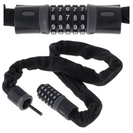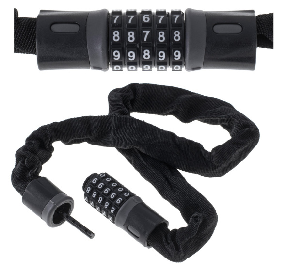 Zámek na kolo s 5místným kódem - vynikající zabezpečení proti krádeži. Barva: černá. Hmotnost: 0,6 kg. Materiál: kovový řetízek potažený látkou, zapínání z plastu a kovu. Dlouhá. řetěz: 90 cm. Lat.: 3 cm.