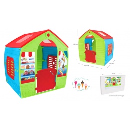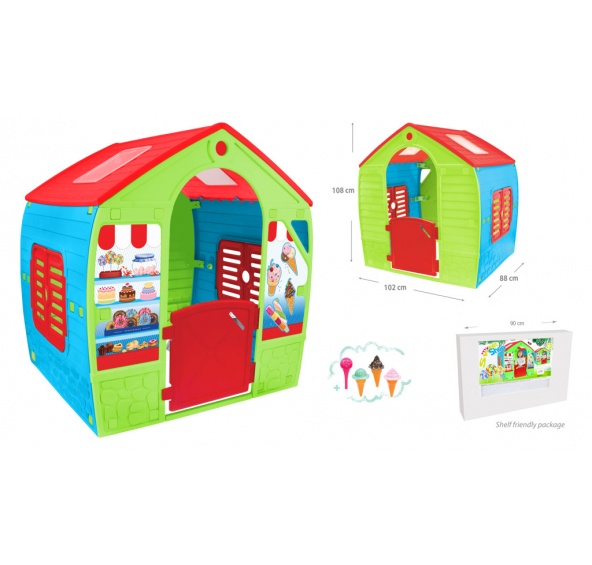 Zahradní domeček se zahrádkou. Domeček má zavírací dvěre a okna. Obsahuje příslušenství – kornouty se zmrzlinou a polepky. Velikost domečku 102×88×120 cm. Vyrobeno z vysoce kvalitního plastu v EU.