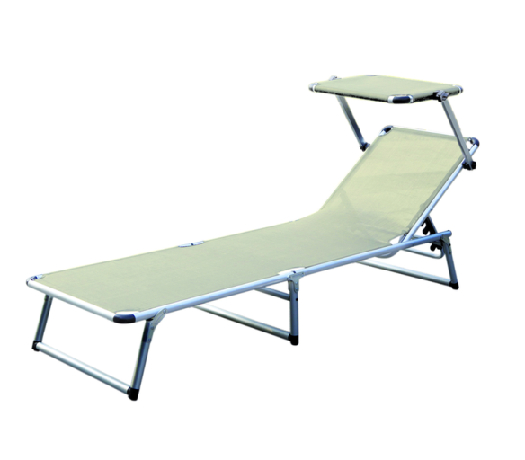 Skládací zahradní lehátko se stříškou a zpevněnou hliníkovou konstrukcí, v moderním designu, vhodné pro zahrady, na kempování či pláže.
