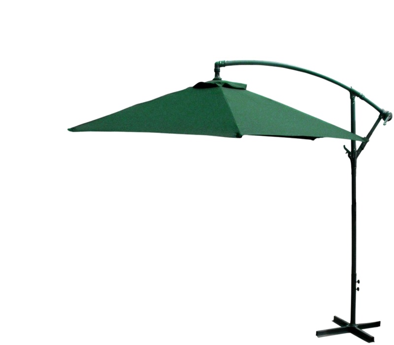 Praktický zahradní slunečník vyrobený z odolného polyesteru, jehož noha je umístěna mimo stíněnou plochu.