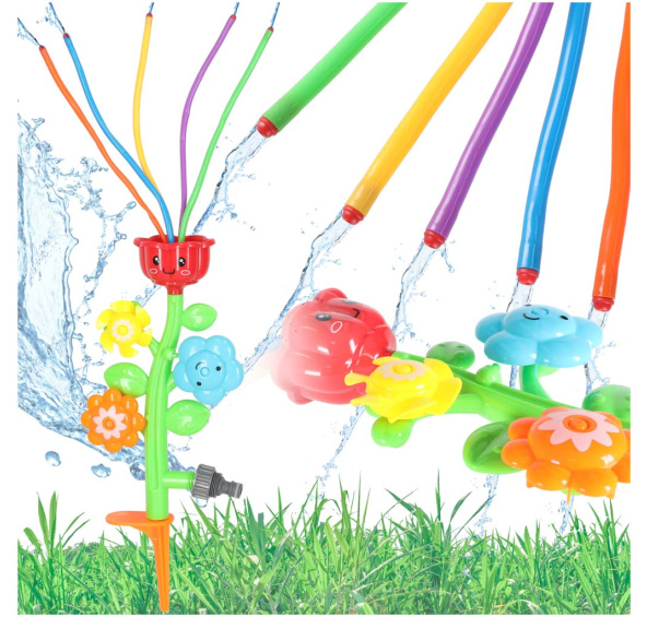 Na rozdíl od klasických zahradních postřikovačů s přesně určeným směrem postřiku, se tato dětská fontána v designu veselých kvítečků otáčí a při tom náhodně ostřikuje své okolí pomocí 6 barevných trubic.